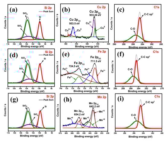 High-resolution XPS-spectra. (a) Si 2p, (b) Cu 2p, (c) C 1s of SiCuG. (d) Si 2p, (e) Fe 2p, (f) C 1s of SiFeG. (g) Si 2p, (h) Mn 2p, (i) C 1s of SiMnG.