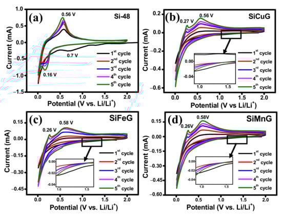 Cyclic voltammograms for 1–5 cycles of (a) Si-48, (b) SiCuG, (c) SiFeG, and (d) SiMnG vs. Li/Li+ as a counter electrode with 1 M LiPF6 in EC:DEC:FEC (v/v ratio of 5:70:25) at 0.1 mV s−1 scan rate in the potential window of 0.01–2.0 V.