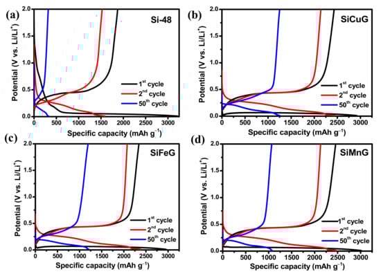 Voltage vs. specific capacity profiles for 1st, 2nd, and 50th cycles of (a) Si-48, (b) SiCuG, (c) SiFeG, and (d) SiMnG vs. Li/Li+ as counter electrode with 1 M LiPF6 in EC:DEC:FEC (v/v ratio of 5:70:25), at 200 mA g−1 in the potential window of 0.01–2.0 V.