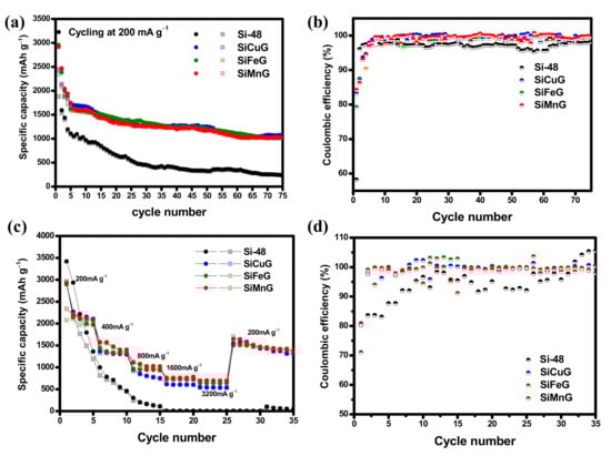 (a,b) Cyclability and respective Coulombic efficiency at 200 mA g−1 in the potential window of 0.01–2.0 V. (c,d) Rate capability and respective Coulombic efficiency results at applied currents of 200–3200 mA g−1 in the potential window of 0.01–2.0 V of Si-48, SiCuG, SiFeG, and SiMnG vs. Li/Li+ as counter electrode with 1 M LiPF6 in EC:DEC:FEC (v/v ratio of 5:70:25) electrolyte.