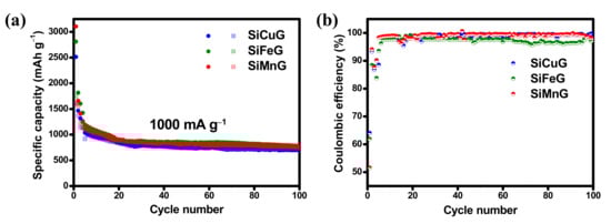 The long cyclability and CEs of prepared materials were evaluated by cycling at high currents of 1000 mA g−1, and the results are shown in Figure 11a and Figure 11b, respectively. The three electrodes showed declined capacities in the initial cycles, but after 20 cycles, the capacities are stabilized. In the initial cycle, SiCuG, SiFeG, and SiMnG delivered 2514/1609, 2810/1740, and 3105/1600 mAh g−1 capacities with 64%, 61%, and 51% CE. After 100 cycles, the materials managed to deliver 704/696, 779/758, and 754/740 mAh g−1 specific capacities with 98.8%, 97.3%, and 98.1% CE, respectively. The capacity retention values compared with the 10th cycles are 73.6%, 72%, and 72.4%, respectively, and suggest the highly stable microstructures of metal-doped Si/G composite even at higher applied currents.