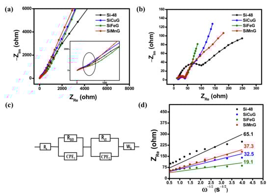 Electrochemical impedance spectroscopy results (a) before cycling and (b) after 25 cycles at 500 mA g−1. (c) Equivalent circuit; (d) ZRe vs. ω−1/2 plots of Si-48, SiCuG, SiFeG, and SiMnG vs. Li/Li+ as counter electrode with 1 M LiPF6 in EC:DEC:FEC (v/v ratio of 5:70:25) electrolyte.