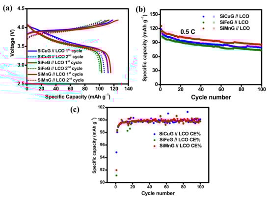 (a) Potential vs. specific capacity plots for 1st and 2nd cycles. (b) Cyclability, (c) Coulombic efficiency results of SiCuG // LCO, SiFeG // LCO, and SiMnG // LCO full cells with 1 M LiPF6 in EC:DEC:FEC (v/v ratio of 5:70:25) electrolyte at 0.5 C, in the potential window of 2.8–4.2 V, respectively.