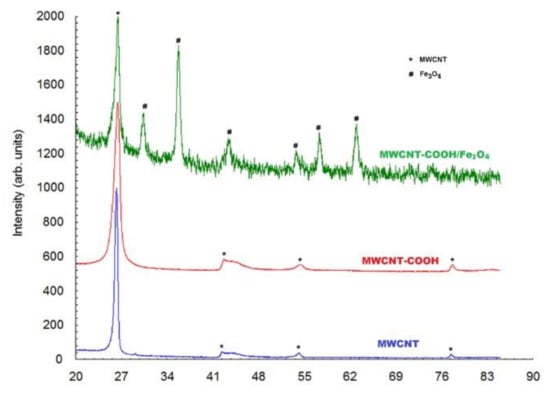 These bands were shifted in the MWCNT–COOH/Fe3O4 spectrum at 1725, 1613, 1567 and 1201 cm−1, respectively, probably due to the interactions of magnetic nanoparticles on the MWCNT-COOH surface. The characteristic absorption band for Fe-O bond from Fe3O4 situated in the spectral range 375–650 cm−1 was observed at 596 cm−1 and revealed the presence of magnetite nanoparticles on the surface of oxidized MWCNTs [].