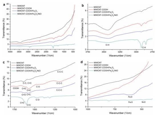 The FTIR spectra of MWCNT, MWCNT-COOH, MWCNT-COOH/Fe3O4 and MWCNT-COOH/Fe3O4/NiO: (a) 4000–400 cm−1 spectral domain; (b) 3750–2750 cm−1 spectral domain; (c) 1800–1000 cm−1 spectral domain; (d) 1000–400 cm−1 spectral domain.