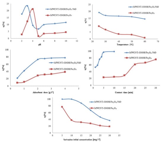 From Figure 9, it can be seen that the removal efficiency of tartrazine depended on the adsorbent used. If the MWCNT-COOH/Fe3O4/NiO nanocomposite was used as an adsorbent, the degree of removal of tartrazine increased in the first 5 min to 97.3%. When using the MWCNT-COOH/Fe3O4 nanocomposite as an adsorbent, the degree of tartrazine removal increased with increased contact time after 15 min.