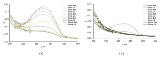 The degradation of 10 mg L−1 tartrazine after the addition of 1 g L−1 MWCNT-COOH/Fe3O4 with and without illumination can be observed in Figure 10 and Figure 11. In Figure 12 can be observed that under UV illumination without any catalyst, there was no tartrazine signal modification within of exposure.