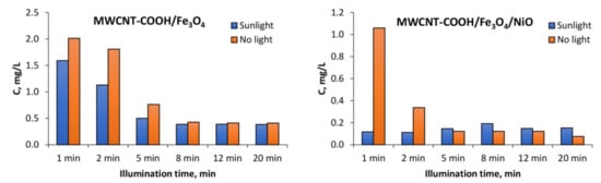 In the case of the MWCNT-COOH/Fe3O4 nanocomposite, it can be seen that the presence of simulated sunlight radiation increased the rate of tartrazine degradation by about 20% in the first 2 min of irradiation, and after 5 min it dropped to 10%. After 8 min of UV irradiation, the degradation process in both cases (with and without UV irradiation) was not effective anymore. The amounts of leftovers were constant with time and were at the level of 150% of the blank value, which indicated that the tartrazine was not totally decomposed.
