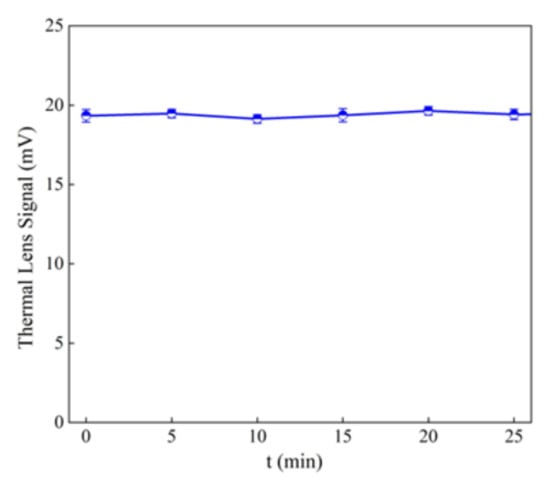 A diode-pumped solid-state laser (ACX-HTSK, OXXIUS S.A., France) was used as the excitation beam source that operated at 405 nm wavelength and provided 5 mW output power at the position of a 10 mm rectangular quartz detection cell (Starna Scientific Ltd., model 1/Q/10, Pfungstadt, Germany). The induced thermal lens was probed by a He-Ne laser (UNIPHASE, Model 1103P, Edmund Optics, Barrington, NJ, USA) of 2 mW output power at 632.8 nm wavelength. An amplified photodiode (PDA 36A-EC, THORLABS, Newton NJ, USA), placed behind a pinhole and an interference filter 632.8 nm, (FL632.8-1 MELLES GRIOT, USA), monitored the probe beam intensity changes. The photodiode was connected to a lock-in amplifier (STANFORD RESEARCH INSTRUMENTS, SR830 DSP, Sunnyvale, CA, USA). The excitation beam was modulated by a mechanical chopper (SCIENTIC INSTRUMENTS, Control unit model 300C, chopping head model 300CD, chopping disks model 300H, Trowbridge Wiltshire, UK) at 7 Hz, which provided the maximum signal to noise ratio. The excitation beam was focused by a 25 mm diameter lens of 100 mm focal distance (VIS 0° Coated Double-Convex (DCX) Lenses, EDMUND OPTICS, USA) and directed onto the dichroic mirror (HR488+514, HT633/45°, LASER COMPONENTS) by a set of broadband, flat mirrors (400–750 nm, BB1-E02 THORLABS). The probe beam was collimated in a diameter of 3 mm using two lenses (VIS 0° Coated Double-Convex (DCX) Lenses, EDMUND OPTICS, Barrington, NJ, USA) of 30 and 100 mm, respectively. The dichroic mirror enabled overlapping and collinear propagation of the excitation and probe beams and directed them onto the detection cell, before reaching the photodiode.