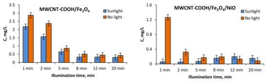 Khan et al. in 2018 [] prepared nanocomposites of MWCNTs loaded with ZnO/NiO by means of a co-precipitation method, that were successfully used as photocatalysts in the process of textile azo dye degradation. The photodegradation ability of MWCNTs loaded with ZnO was higher than a single ZnO material. The addition of a small quantity of NiO (3%) onto the surface of MWCNT-ZnO, increased the photocatalytic activity of the whole composite, but further study is needed to determine the exact role of NiO in the photodegradation process [].