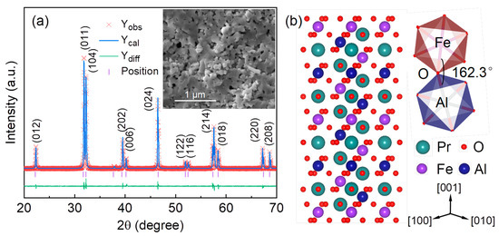 (a) X-ray diffraction pattern of Pr2FeAlO6 ceramic. Inset shows the SEM image. (b) The crystal structure of double perovskite Pr2FeAlO6. The crystallographic is constructed by the crystal structure visualization software (Diamond) and the lattice constants are obtained from the Rietveld structure refinement.