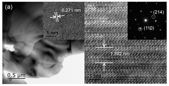 Formation of a well-crystallized compound was confirmed by a thorough TEM/HRTEM and SAED analysis, as shown in Figure 2. Sharp edges for the Pr2FeAlO6 evidence the high crystalline nature. The lattice fringe shown in the inset of Figure 2a indicates the (110) plane orientation corresponding to d-spacing of 0.271 nm. The lattice parameter c shown in Figure 2b along (001) orientation can be also determined to be 1.302 nm, which is consistent with the previous XRD result. The selected area diffraction pattern (SAED) with a regular and clear hexagonal diffraction confirms the polycrystalline nature of the Pr2FeAlO6 sample. The results obtained from HRTEM and SAED studies agree well with the XRD results, which further evidence the phase formation.