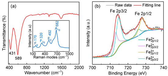 To examine the local structural distortion, a room temperature FTIR spectrum was recorded in the range from 400 to 1000 cm−1. The transmission mode 431 cm−1 is related to Fe/Al–O bending vibrations of Fe/AlO6 octahedral [30,31]. The broad transmission band observed around 589 cm−1 is correlated to the anti-symmetric stretching vibrations of Fe/Al–O bonds within octahedra [32,33]. A small shift of this mode compared to symmetry perovskite with Pbnm group space in Pr2FeAlO6 is attributed to the occurrence of octahedral lattice strain induced by rapid cooling treatment. The recorded room-temperature Raman spectrum of Pr2FeAlO6 is shown in inset of Figure 3a. The Raman spectrum is found to be dominated by three peaks at 320 cm−1, 492 cm−1, and 682 cm−1, which are assigned to the symmetric bending vibration, antisymmetric stretching and symmetric stretching vibrations of the octahedra, respectively [13,34]. Also, the low vibration mode located at 170 cm−1 may be related to the stretching vibrations of Pr ion, which is generated by the lattice translation [34]. Because of the non-centrosymmetric position of Pr ions, the ground-state energy is split. The interaction between rare-earth and iron can impact this translation. Such displacement gives evidence of magnetic interaction in sublattice. Figure 3b shows the 2p3/2 and 2p1/2 XPS spectra for Pr2FeAlO6 sample. Spin-orbit split 2p3/2 and 2p1/2 of Fe2p region appear at 714.2 and 727.1 eV, respectively. The observed asymmetric broad peak indicates the coexistence of Fe3+ and Fe2+. The relative amount of the Fe3+ to Fe2+ ion ratio has been quantitatively analyzed by the integration of peak areas for both ions. The peak ratio (the sum of the peak area and divided by the sum of peak area and ) of Fe3+/Fe2+ is 4.11. The partial conversion of Fe3+ to Fe2+ arises from the substitution of Fe ion by Al ion, and the total charge balance of the sample may be compensated by the oxygen vacancies. The presence of Fe2+ lowers the intensity of the high energy region and weakens the orbital hybridization intensity at A-site and oxygen, which elongates the bond length between Pr3+ and O2− and leads to polarization enhancement [23].