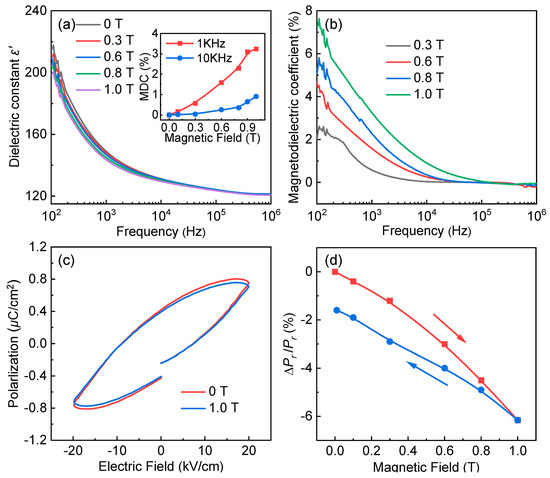 (a) Frequency dependence of (a) dielectric constant ε′ and (b) magnetodielectric coefficient (MDC) under different applied magnetic fields at room temperature, the inset of (a) shows the MDC dependence of the applied DC magnetic field; (c) P–E loops with and without magnetic field perpendicular to the thickness direction; (d) the estimated fractional change in Pr with H for the Pr2FeAlO6 compound.