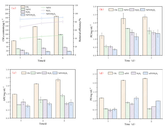 Combined effect of NZVI and H2O2 on the growth of M. aeruginosa for (a) Chl a contents; (b) PC contents; (c) APC contents; and (d) PE contents. Mean ± standard deviation of three replicates is shown for each value.