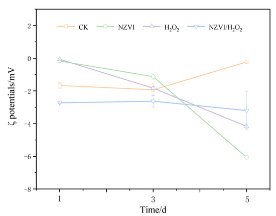 3.2. Effects of NZVI and H2O2 on the Zeta Potential