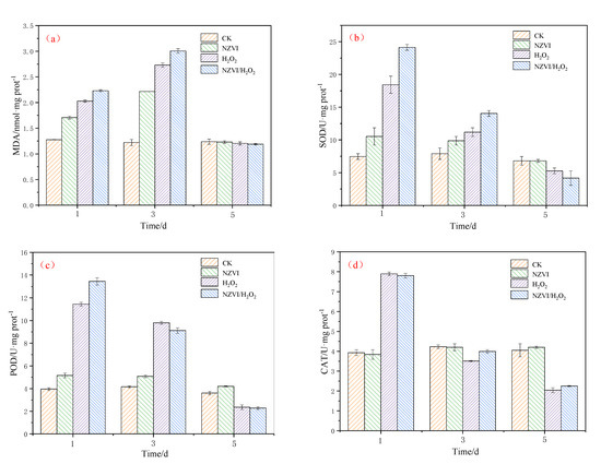 3.3. Effects of NZVI and H2O2 on the Antioxidant System