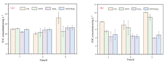AOMs, including EOM and IOM produced by M. aeruginosa, may pose a threat to human health, especially in the drinking water treatment that disinfects with chlorine-containing disinfectant [3,7]. Exposure of M. aeruginosa to different treatments results in EOM and IOM variations. As Figure 4a shows, the EOM removal efficiency in terms of TOC is 37.8%, 27.6%, and 27.3% for NZVI, H2O2 and NZVI/H2O2 treatment on the 5th day, respectively, while the IOM removal efficiency is 11.7%, 61.3%, and 54.1%, respectively (Figure 4b). Compared with H2O2 and NZVI/H2O2, NZVI is much more effective for EOM removal, but it is less effective for IOM removal. The reason for this phenomenon may be that NZVI removes TOC by adsorption or agglomeration [13,30], while H2O2 and NZVI/H2O2 remove TOC by oxidation [24,25].