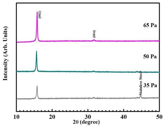 Figure 2 is XRD diffractograms of the crystal structure of NNMO films under different oxygen partial pressures. It can be seen that in addition to the peak of the stainless steel substrate, there are only two peaks in the direction of (00l): (002) and (004), indicating that the height along the c-axis along the film is in merit-based orientation. At lower oxygen partial pressures, the diffraction peak is weaker, indicating low crystallinity. This may be due to the low partial pressure of oxygen, which introduces oxygen vacancies. As the partial pressure of oxygen gradually increases, the diffraction peak becomes sharper and sharper, and the crystallinity increases. When the partial pressure of oxygen gradually increases to 65 Pa, the oxygen vacancy is suppressed, the defect is reduced accordingly, and the crystallinity of the film is significantly improved.