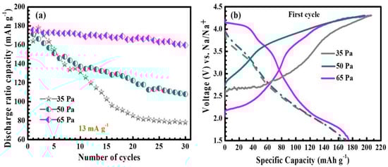 Figure 4 shows the room temperature electrochemical properties of the NNMO film as a sodium-ion battery cathode material under constant current 13 mAg−1, voltage window 1.5–4.3 V test conditions. Figure 4a is a constant current cycle curve of the thin film deposited under different oxygen partial pressures. The first discharge-specific capacities of the 35 Pa, 50 Pa, and 65 Pa thin film electrodes were 163.9 mAh g−1, 171.1 mAh g−1, and 175.3 mAh g−1, respectively. It can be seen that, for the samples grown under 35 Pa and 50 Pa, the discharge-specific capacitance decreases rapidly when the number of cycles increases. After 30 cycles, the capacity retention rate was only 48% (78.2 mAh g−1) and 63% (108.0 mAh g−1) of the initial values, respectively. It may be that under the lower oxygen pressure, the crystallinity of the film is not perfect, oxygen deficiency can form structural defects, the particles are irregular, and the interface is blurred, resulting in slow sodium ion kinetics. When the oxygen pressure gradually increases to 65 Pa, the oxygen defect is inhibited, the crystallinity is enhanced, the crystal plane spacing is increased, and the thickness of the sodium ion layer is also increased, which can enhance the deblocking kinetics of sodium ions. The specific capacity retention rate of the 65 Pa thin film electrode is 91%, which is much higher than that of the 35 Pa and 50 Pa thin film electrodes, showing excellent cycle stability.