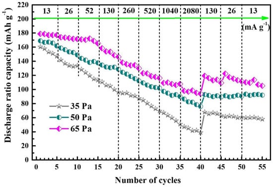 Figure 5 compares the discharge rate characteristics of the NNMO thin film electrode under different oxygen partial pressures, and the charge and discharge voltage range and charging current density are the same as the previous parameter settings. Obviously, in a lower oxygen partial pressure environment (35 Pa and 50 Pa), the thin film material is in a mixed state of crystalline and amorphous state, and this incomplete crystallization during charge–discharge will hinder the diffusion and migration rate of sodium ions and electrons, so the first discharge specific capacity is low, and the decay is faster with the increase of discharge current density. When the partial pressure of oxygen is increased to 65 Pa, the crystallinity of the thin film material is improved, the particle size is uniform, and the discharge-specific capacity and capacity retention rate are improved. Although it also shows rapid decay at higher current densities above 520 mA g−1, when the current density is restored to 130 mA g−1, its discharge-specific capacity can be maintained at about 70%, indicating that the thin film cathode material can withstand high current charge and discharge.