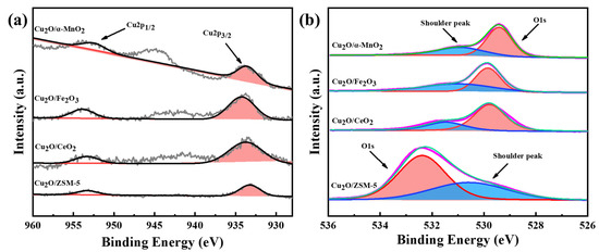 XPS analysis was performed on the Cu2O/S (S = ZSM-5, CeO2, α-MnO2, and Fe2O3) catalysts to further investigate the states of valence, surface chemical coordination, and composition. The results of Cu 2p and O 1s spectra are shown in Figure 11. Specifically, the pristine Cu2O/α-MnO2, Cu2O/Fe2O3, Cu2O/CeO2, and Cu2O/ZSM-5 catalysts showed the 2p3/2 peak of Cu+ at 931.38 eV (Figure 11a). This indicates the presence of the Cu2O species on the support surface. As shown in Figure 11b, the O 1s main peak of the catalyst was around 529.36–529.46 eV, and the shoulder peak was around 530.76–530.96 eV. To be specific, the peaks of 529.36–529.46 eV and 530.76–530.96 eV could be attributed to surface adsorbed oxygen (Oads) and lattice oxygen (Olatt), respectively [45]. However, the location of the main peak and shoulder peak of Cu2O/ZSM-5 catalyst differed greatly from the catalysts above. The shoulder peak at 530.58 eV should be attributed to the O species of Si-OH on the surface of SiO2 support, rather than the surface-adsorbed oxygen (Olatt) [46,47]. In general, the number of the Oads mainly depends on the number of oxygen vacancies at the surface. The reason is that the Oads could only be absorbed on the oxygen vacancies. Thus, the Oads/(Olatt + Oads) ratio became the valid parameter to analyze the content of the surface oxygen vacancy. Table 3 shows that the O 1s shoulder peak area ratio (Oads/(Olatt + Oads)) of the Cu2O/CeO2, Cu2O/Fe2O3, Cu2O/ZSM-5, and Cu2O/α-MnO2 catalysts were 31.8%, 46.67%, 37.46%, and 21.26%, respectively. Although the (Oads/(Olatt + Oads)) ratio of Cu2O/α-MnO2 catalyst is somewhat lower compared with other supported Cu2O catalysts, the Cu2O/α-MnO2 catalyst exhibits excellent catalytic performance. This suggests that the ratio of O 1s shoulder peak area has a close relationship with the type of support.