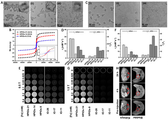 (A) Transmission electron microscopy (TEM) images and high-resolution TEM (HRTEM) images (inset) of HPIOs-21 (i), HPIOs-14 (ii), and HPIOs-9 (iii). (B) Field-dependent magnetization curves (M−H) of HPIOs-21, HPIOs-14, HPIOs-9 at a magnetic field of 5 T at 300 K (insets: magnification of M−H curves from −1000 to 1000 Oe). (C) TEM images of HPIOs-14@ZDS incubated in PBS (pH 7.4) buffer for 1 (i), 2 (ii), and 4 (iii) h, respectively. Relaxation measurements of HPIOs and IOs at (D) 0.5 and (F) 1.5 T. T1-weighted phantom imaging of HPIOs-21, HPIOs-14, HPIOs-9, IO-26, IO-17, and IO-11 on (E) 0.5 T and (G) 1.5 T MRI scanners. (H) In vivo T1 MR imaging in the axial plane of rats before and at 4 and 24 h after injection of HPIOs-14 at a dose of 0.05 mmol Fe/kg body weight. Arrows and dotted circles indicate the kidneys and bladder, respectively. Reprinted with permission from Ref. [58]. Copyright 2018, American Chemical Society.