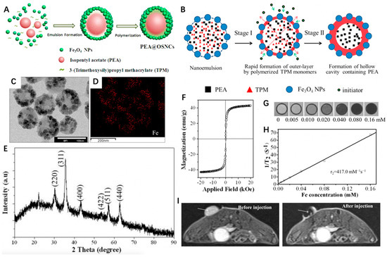 Through a facile and template-free synthetic strategy, Ma et al. [78] constructed a unique hollow core/satellite shell-structured organosilica nanocapsule (OSNC) with Fe3O4 embedded onto the shell and isopentyl acetate (PeA) liquid encapsulated in the cavity (denoted as PeA@OSNC) (Figure 2A). The structural transformation of Fe3O4 NPs stabilized by 3-(trimethoxysilyl)propyl methacrylate (TPM)/PeA oil nanoemulsion to the final hollow structure of OSNC could be divided into two stages. First, the polymerized organosilica outer layer embedded with numerous Fe3O4 NPs could be formed immediately upon addition of the initiator potassium persulfate (KPS), because the outermost TPMs of the nanoemulsion were earlier involved in radical polymerization compared to the interior ones. Afterward, the polymerization continuously occurred in the sealed liquid phase where the free TPMs tended to gradually diffuse outward from the center and took part in shell formation, thus leaving a cavity containing PeA (Figure 2B). As we can see from Figure 2C–E, the PeA@OSNC NPs exhibited a uniform spherical structure with an average diameter of 82 nm, in which the uniformly distributed small NPs (<10 nm) could be ascribed to Fe3O4 NPs. According to the field-dependent magnetization curve, the MS value of OSNC was 42.9 emu g−1 (Figure 2F). The feasibility of OSNC as a negative CA for MRI was then investigated, the contrast of images showed a gradual decrease with the increased Fe concentration, and the corresponding r2 was calculated to be 417.0 mM−1 s−1 (Figure 2G,H). As for in vivo MRI, the mean signal intensity of the tumor site displayed a significant decrease from 188 to 52 after injection of PeA@OSNC for 1 h. These results indicated the great promise of as-synthesized PeA@OSNC for future clinical application in cancer diagnosis and drug delivery systems.