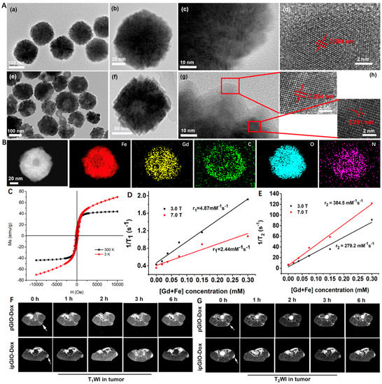 (A) TEM images of (a–c) MIO and (e–g) GdIO. HRTEM images of (d) MIO and (h) GdIO. (B) Energy dispersive spectrometry mapping images of GdIO. (C) Field-dependent magnetization curve of GdIO at 3 and 300 K. (D) Transverse relaxation rate and (E) Longitudinal relaxation rate of ipGdIO-Dox measured using 3.0 T and 7.0 T MRI scanners. (F,G) T1- and T2-weighted MR images of cancer-bearing mice at coronal planes after injection of pGdIO-Dox and ipGdIO-Dox. Reprinted with permission from Ref. [81]. Copyright 2022, American Chemical Society.