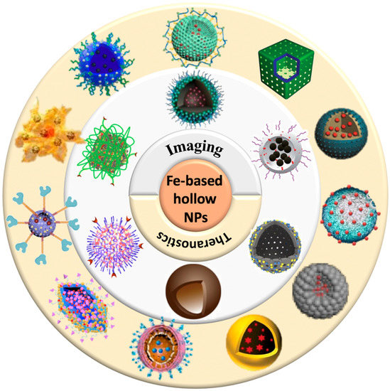 Over the past decade, Fe-based nanomaterials have been of great interest for cancer theranostics, owing to their excellent biocompatibility and biosafety, unique magnetic performance as well as superior therapeutic features [43,44,45]. So far, Fe-based nanomaterials have been widely involved in magnetic hyperthermia therapy (MHT), PTT and CDT, etc. [46,47,48,49]. As for MRI, apart from the feasibility of IO NPs as T2-weighted MRI CAs, Fe-based complexes and ultrasmall IO NPs are ideal T1-weighted MRI CAs [50,51]. Notably, PTAs utilized for PTT are also ideal photoacoustic imaging (PAI) CAs [52,53]. To enlarge the diagnostic and therapeutic efficacy, Fe-based hollow nanoplatforms (Fe-HNPs) have attracted great attention [54,55,56,57]. On one hand, Fe species themselves, such as magnetic IO NPs, can be ideal hollow nanocarriers [58]. On the other hand, several hollow NPs can serve as the matrices to support different Fe components [59]. Up to now, the synthetic strategies for hollow nanostructures are mainly divided into two categories, i.e., the sacrificial-template-based method (e.g., the utilization of different hard and soft templates) [60,61] and the self-templating method (e.g., the involvement of the nanoscale Kirkendall effect, galvanic replacement reaction and Ostwald ripening process) [62,63]. Of note, Fe-based nanoplatforms not only display great promise in MRI, the cavity of which are also capable of loading diverse fluorescent dyes, chemotherapeutic drugs, photosensitizers for fluorescence imaging (FLI), chemotherapy and photodynamic therapy (PDT), respectively. For example, Ying et al. [64] reported a magnetic nanocatalytic system comprised of glucose oxidase-loaded hollow iron oxide nanocatalysts (HIONCs) to drive starvation–chemodynamic–hyperthermia synergistic cancer therapy. Cai et al. [65] used hollow Prussian blue (PB) NPs to load chemotherapeutic drugs that could achieve efficient chemotherapeutic-thermal treatment of tumors in vivo. In short, multifunctional all-in-one theranostics can be easily obtained with rational and ingenious design on the basis of Fe-HNPs [66,67,68,69].