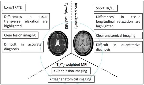 Schematic illustration of the characteristics of T1-, T2-, and T1/T2-weighted dual-modal MRI.