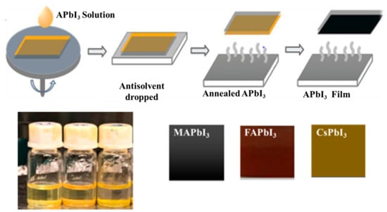 Lead (II) iodide (), methylammonium iodide , cesium iodide , formidinium iodide purchased from sigma Aldrich, N,N-dimethylformamide anhydrous (), and dimethyl sulfoxide () from Thermo Scientific, the antisolvent chlorobenzene from Sigma-Aldrich, were used as precursor materials to fabricate the perovskite thin-film solutions. Then the prepared solution of , where was spin-coated for 20 s at 2000 rpm on the substrate. The deposition procedure is shown in Figure 1, where on top we displayed steps to deposit perovskite samples via the spin-coating method and at bottom of Figure 1 we displayed the as-deposited samples along with precursor solutions for perovskite materials.