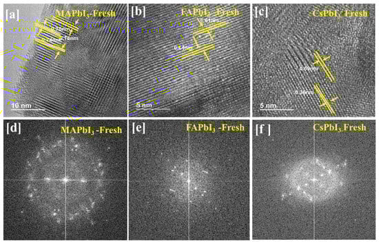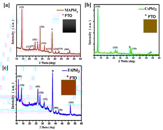 The impact of changing cation A on the thin films’ microstructure was explored by XRD Figure 2, where we can see the locations and the plans of diffractions peaks: 14.0 (110), 24.0 (202), 28.0 (220), 32.0 (222), 37.5 (400), and 52.0 (303). These crystal structures are fundamentally very similar; growth was shown at the peak at 2θ = 14°, which corresponds to shown in Figure 2a and (110) as (hkl) shown in Figure 2c. The orange phase is also for the (110) peak of shown in Figure 2b, which is the most prominent peak among the three compounds. However, a continuous displacement between the crystal structures is observed. Substantially, there is a highly crystalline phase, especially when there is an overly lattice strain. This remark shows the ability to substitute readily for the cations (MA, FA, and Cs) across the lattice without harming the crystal structure. The structure to be studied is correlated with the same diffraction peaks. Furthermore, the height (110) intensity is enhanced for the film.