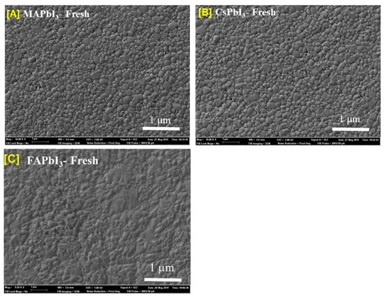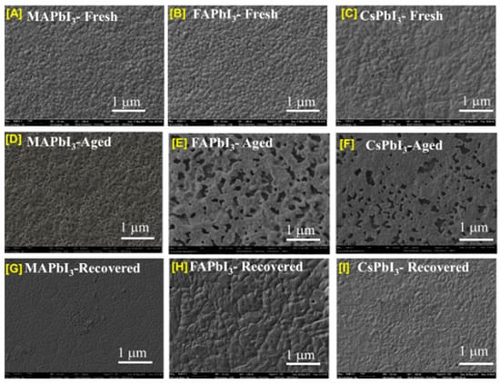 From the photographs , as shown in Figure 8 and Figure 9, the color changes from a deep color to a clear color due to the dissociation or phase transition of perovskite. The same process was also analyzed with the subject to SEM studies by analyzing the surfaces of the deposited, degraded, and thermally treated samples. From Figure 12, a pinhole and change in surface morphology are apparent for pure aged FA and MA samples compared to fresh ones, but we can note that for samples that show good stability and are well recovered by thermal treatment, the surface shows fewer pinholes. This is in agreement with the results of the absorption spectra (plotted in Figure 11) and visual inspection in Figure 9, which confirms the stability; here, we can offer the route to enhance the stability of . We confirm that the incorporation of enhances the stabilization of perovskite and our results are in good agreement with the literature [].