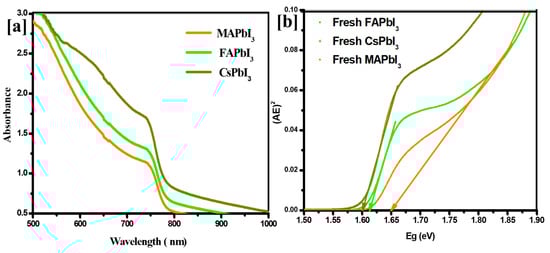 The corresponding UV–Vis spectra of , , and were recorded [300 nm–1000 nm] (Figure 6a). Different cations shift the absorption edge to a high wavelength, reducing the perovskite films’ defect density and increasing their crystallization quality. Furthermore, the optical bandgap is in good agreement.