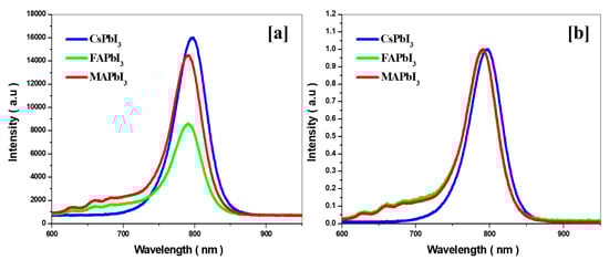 The PL measurements were canned at the ambient temperature as shown in Figure 6b. The PL peak intensity between 700–850 nm previously mentioned progressively increases with the film. However, by changing the cation A (FA) by MA and Cs, the PL intensities vary. A suggestion is that thin film is the optimal level at which it can better ambush, owing to the improvement of crystallinity and surface passivation, the absorption shift.
