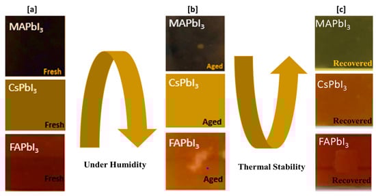 The serious problems are the stability issues for the commercialization of perovskite solar cells. The halide perovskite components are related through weak interactions such as ionic and hydrogen bonding. The decomposition of organic species and the ion migration happen quickly in perovskite solar cells under moisture penetration as shown in Figure 8 and Figure 9 []. In this part, we discuss the stability from the viewpoint of cation exchange, , , and stabilization, and the best solution for reducing efficiency leakage. Figure 8 shows pictures of samples that were put in 60% humidity under dark conditions, and from Figure 8 it is clear that and have gone through degradation while shows resilience against humidity. A few pinholes were observed in samples just by visually inspecting the surface of the samples. The crystallography of the same samples was also analyzed by performing XRD of these samples.