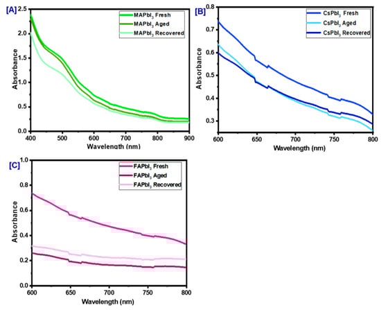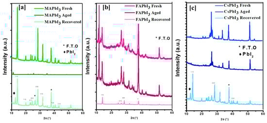 Figure 10 shows the XRD patterns of fresh , , and thin films, aged for four weeks in the air at 60% humidity under dark conditions and recovered with thermal treatment under temperature 100 C. Although no technique is generally used to measure the stability of perovskite thin films, a simple procedure was developed to analyze them. By comparing the values of the intensities, this method was developed to detect the most stable thin film. Relative to fresh spectra, essential changes do not happen in ranges; for example, in the appearance of new peaks, a percentage decrease in intensity appears to relate with stability since the number of perovskite diffraction planes is proportional to the total power. This phenomenon explains that the new the peaks that appear on older films correspond to new phases and demonstrate the partial degradation of the , , and thin films. The recovered and samples showed significantly increased stability by thermal treatment due to the hysteretic effect of these materials related to phase transition. Remarkably, the intensity of the recovered pieces is higher than the aged and prepared. On the other hand, the film showed low stability compared to the perovskite based on cesium, see Figure 10. This study suggests that improves crystal quality and has high stability. However, we can see the appearance of the non-perovskite Ɣ phase for the film in the spectrum in Figure 10b, showing that parts of the structure had deteriorated in new phases; thus, we can announce that this study proves that is the most efficient in these conditions. The absorption results confirm this conclusion where the aged and samples show a dramatic decrease compared to the fresh and recovered samples, and these results are plotted in Figure 11.