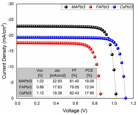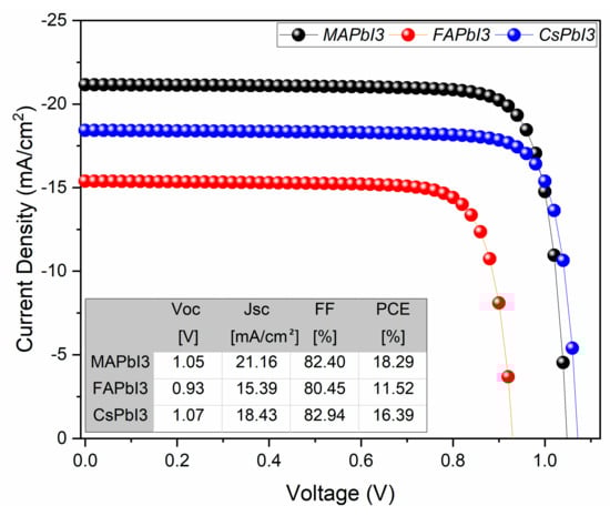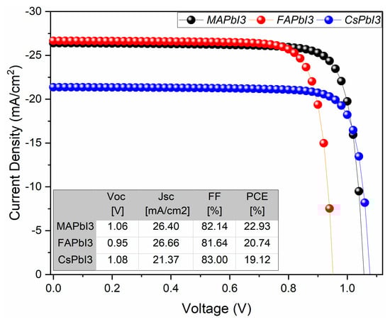 Generally, the solar cells comprise the sandwiched configuration of having perovskite photoactive/absorbers type , charge transport layers, and counter electrodes. Halide perovskite materials can be denoted by ; wherever is an organic methylammonium and formamidinium cesium ions, can be an inorganic cation and can be a halogen ion ( [,,]. Amongst them, the extremely conventional promising active materials are methylammonium lead iodide , formamidinium lead iodide , and cesium lead iodide [,,,]. To realize the efficiency determination of PSCs, we should base the study on the interface of perovskite layers, the transportation process, and the charge extraction. Consequently, we can say that there is a parallel between each path of the crystal quality and the system’s efficiency, and at the interface, non-radiative recombination reduces. The development of the first leads to the enhancement of the other. In our work, the investigation primarily focuses on the cation lead iodide’s stability (where A can be Cs, MA, and FA), and the wide absorption range of the PSC phase. At UV–Vis wavelengths and to optimize photon absorption, the present studies concentrate on halide exchange to modify the bandgap. This work is divided into three main categories.