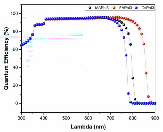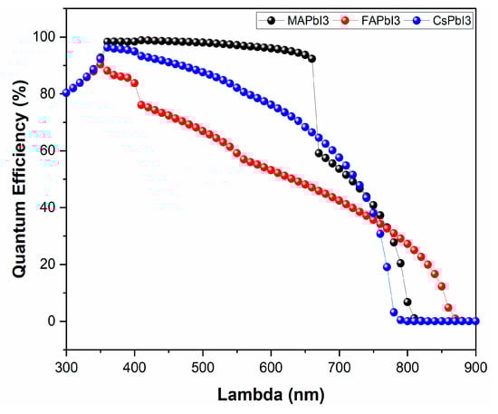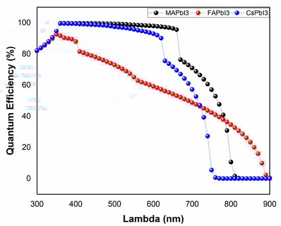 The results for JV characteristics along with QE% for as-deposited samples were plotted in Figure 13 and Figure 14. From the figures, it is visible that solar-cell structure with as the absorber layer has a higher PCE% than other structures, as well as QE%. The reason for this is because of good band alignment and high absorption coefficient with respect to the other two samples, whereas high open-circuit voltage was achieved for the sample due to its wider band gap.