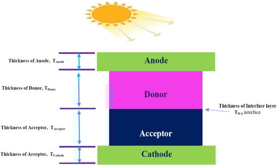 A bi-layer morphology (PHJ) is the structure that is mimicked in the tool. The schematic representation of a bi-layer/(PHJ) OSC is depicted in Figure 1. This structure is created by sandwiching the Donor (D) and Acceptor (A) organic semiconductor layers between two electrodes with opposing work functions [43,44].