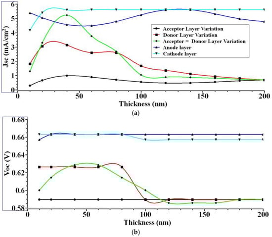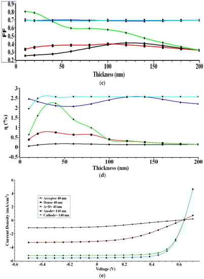 - Finally, the thickness of the donor and acceptor layers, which together make up the active layers, is evenly altered over the range of 10 nm to 200 nm, the remaining layers, such as the anode at 100 nm and the cathode layer at 100 nm, remained constant. According to the simulation findings, the optimal active layer (Donor = Acceptor) thickness is 40 nm, with the resulting values being Jsc = 5.22 mA/cm2, Voc = 0.63 V, FF = 68%, and ɳ = 2.3%. Figure 3a demonstrates a donor–acceptor active layer thickness over 40 nm is useless.