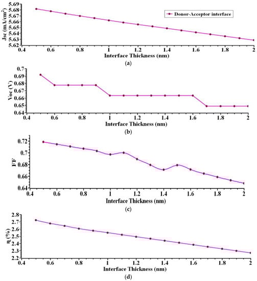 The donor–acceptor interface layer is critical, especially for PHJ devices as it affects the overall performance of the device. Excitons are dissociated at the donor–acceptor interface. Recombination of charge carriers also takes place here. Recombination current is directly proportional to interface thickness. The donor–acceptor interface is diffuse and has a finite thickness. In this research work, the effects of the donor–acceptor interface on each photoelectric conversion process are analyzed by varying the donor–acceptor interface thickness in PHJ systems. Initially, the donor–acceptor interface thickness layer is varied from 0.5 nm to 2 nm, the remaining layers’ such as acceptor 40 nm, donor 40 nm, anode 140 nm, and the cathode layer 100 nm kept constant for this analysis. Figure 4 illustrates the comparison plot characteristics of PHJ device for various donor–acceptor interface layer thicknesses from the J-V curves. As per the simulation findings, the best performance is obtained for the donor–acceptor interface layer thickness of 0.5 nm Jsc = 5.6 mA/cm2, Voc = 0.66 V, FF = 69%, and ɳ = 2.55%. Figure 4 depicts the effect of Jsc, Voc, FF, and interface layer thickness. As shown in Figure 4, increasing the interface layer thickness obviously significantly influences Jsc, Voc, ɳ, and FF. Increasing the interface layer thickness reduces the device’s overall performance.