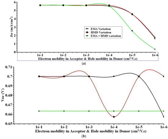 The PHJ OSC’s active layer is bi-layered, including donor and acceptor layers. The work function and conductivity at the active layer of an OSC are tunable by simply adjusting the doping concentration in that layer [49]. That is why it is simple and effective to manipulate the mobility of charge carriers triggered at the heterojunction of the donor–acceptor interface layer. By controlling the mobility of electrons and holes in the active layer, researchers may tailor the s-SWCNT/C70 PHJ OSC performance characteristics. After being generated by light, excitons diffuse to the heterojunction interface in the active organic layer of the cell, where they dissociate into free charge carriers (electrons and holes). The extraction and recombination of charges in an OSC cell are related to the mobility of charge carriers. An increase aids carrier extraction in carrier mobility, which boosts carrier transport and strengthens bimolecular recombination. Charge carriers with low mobility tend to accumulate in a cell, whereas those with high mobilities are more easily extracted, leading to a lower charge carrier density as a result of faster carrier extraction and, hence, a lower Voc for the solar cell. Additionally, the risk of carrier recombination rises with the accelerated extraction of charge carriers. Therefore, the value of external quantum efficiency (EQE) in organic solar cells does not see much improvement in the event of a substantial increase in carrier mobility; instead, a modest increase in EQE happens in such a circumstance. Here, researchers explored the impact of varying the electron and hole mobility on the performance of an s-SWCNT/C70 planar heterojunction solar cell. Changes in electron and hole mobility were used to simulate the effects of these charge carriers on an OSC, the results of which are displayed in Figure 5.