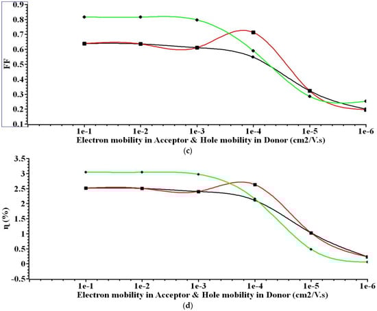 (a) Jsc (b) Voc (c) FF (d) ɳ. Illustrates the output extracted for various mobility charge carriers.