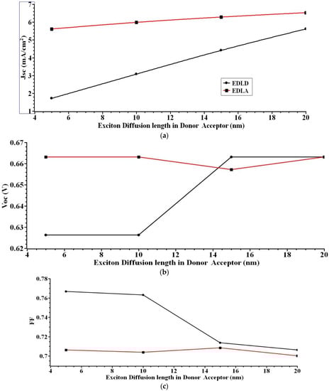 Figure 6 shows the variation of exciton diffusion length of both donor and acceptor material, ranging from 5 to 20 nm. For this research work analysis, the donor material is kept constant as 20 nm and the acceptor material are varied from 5 to 20 nm. Then, the acceptor material is kept constant as 20 nm and donor material are varied from 5 to 20 nm. The simulation results show that Jsc = 6.5295 mA/cm2, Voc = 0.66 V, FF = 70%, and ɳ = 3.032%, the best performance is achieved for the variation in exciton diffusion length, with exciton diffusion length in the acceptor and exciton diffusion length in the donor both at 20 nm.