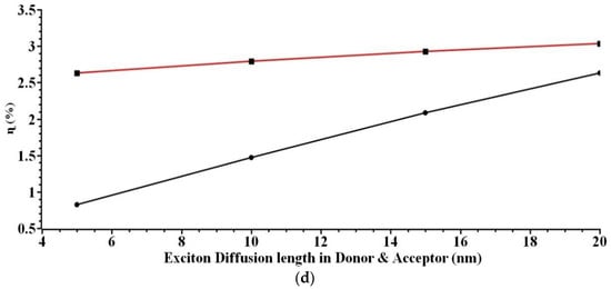 (a) Jsc (b) Voc (c) FF (d) ɳ. Illustrates the output extracted for various exciton diffusion lengths.