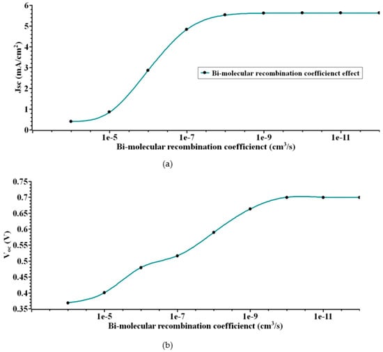 The bi-molecular recombination coefficient strongly influences the performance of the organic photovoltaic cell used in PHJ devices. As a result, optimizing the bi-molecular recombination coefficient is crucial to producing a high-performance solar system. Only at the donor–acceptor interface does recombination of charged carriers take place. The bi-molecular recombination coefficient characterizes the intensity of recombination at the interface.