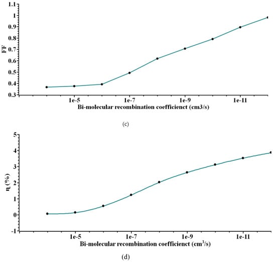 (a) Jsc (b) Voc (c) FF (d) ɳ. Illustrates the output extracted for various bi-molecular recombination coefficients.