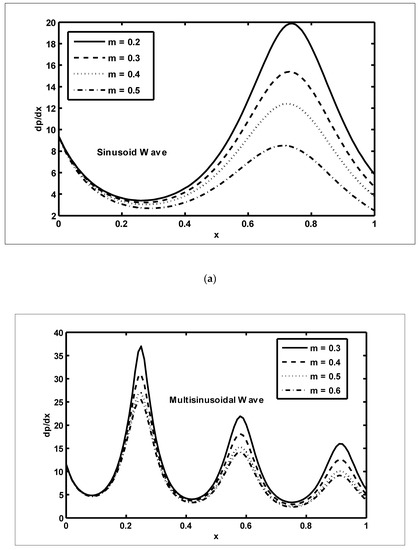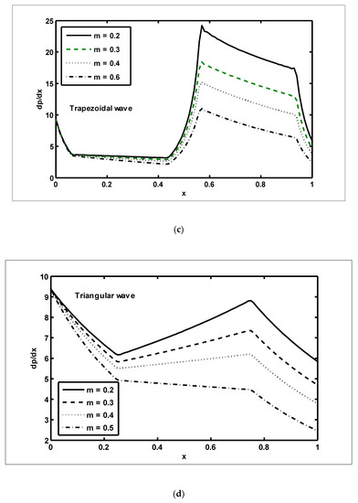 In this section, we present the graphical outcomes of the problem under consideration. To observe the effects of pressure increase with volume flow rate , Figure 2a,b was plotted for diverse values of and To analyse the impact of the pressure increase, the zones of peristaltic flow were spilt into the following regions: (a) the retrograde () zone, in which the flow was travelling in the opposite direction from the peristaltic motion; (b) the peristaltic () zone, in which positive values of were completely due to peristalsis after responding to the difference in pressure; (c) the free pumping () zone; and (d) the co-pumping () region, in which the difference in pressure supported the flow because of the surface walls. From Figure 2a, it can be seen that in the retrograde, peristaltic and free pumping regions, the pressure increased due to the increasing values of , whereas in the co-pumping region, the pressure decreased due to the increasing values of . It is obvious from Figure 2b that pressure decreased with the increasing values of in the retrograde and peristaltic pumping regions but this behaviour was reversed in the co-pumping region. To reveal the impact of pressure gradient on and , Figure 3a,b were plotted. It can be seen in Figure 3a that when , the pressure gradient increased due to the increasing values of Figure 3b was plotted to detect the impact of the pressure gradient for various values of It can be seen in this figure that when , the pressure gradient decreased with the increasing values of In order to examine the consequences of different wave forms on the pressure gradient, Figure 4a–d were plotted. It can be seen in these figures that the maximum pressure gradient was observed in the trapezoidal wave.